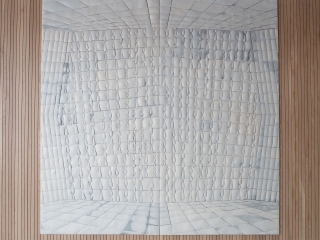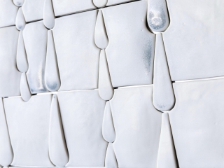The name of the piece out of white porcelain clay is Stage and its atmosphere is stage-like, as it depicts a place that will create a setting for people and ideas to encounter. The droplets depict interaction as well as the continuous movement of thoughts and ideas. Single droplets form paths that grow and join with others to create droplet flows. They allow people to become part of the cycle of nature, rejuvination and life force.